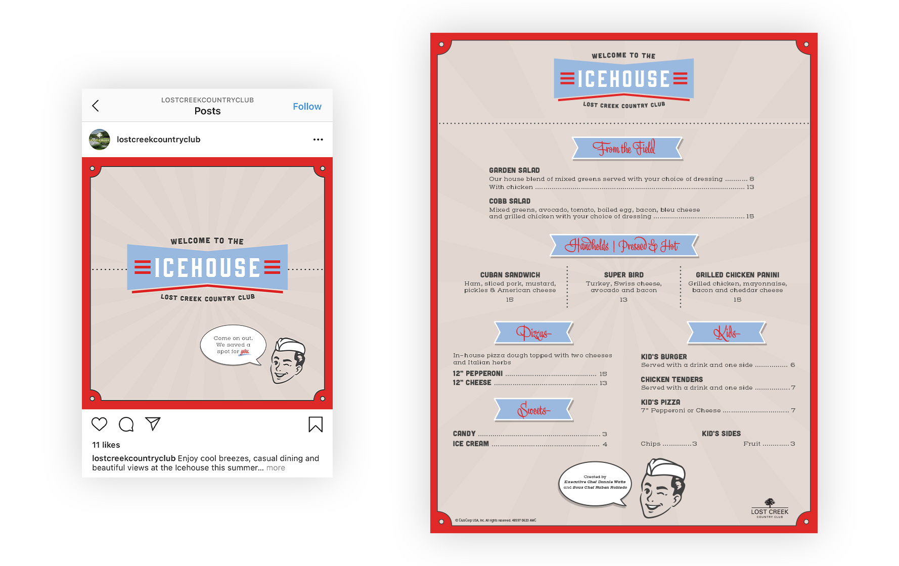 Branding, menu and social media assets designed for Lost Creek Country Club (managed and operated by Invited Clubs, previously known ad ClubCorp)